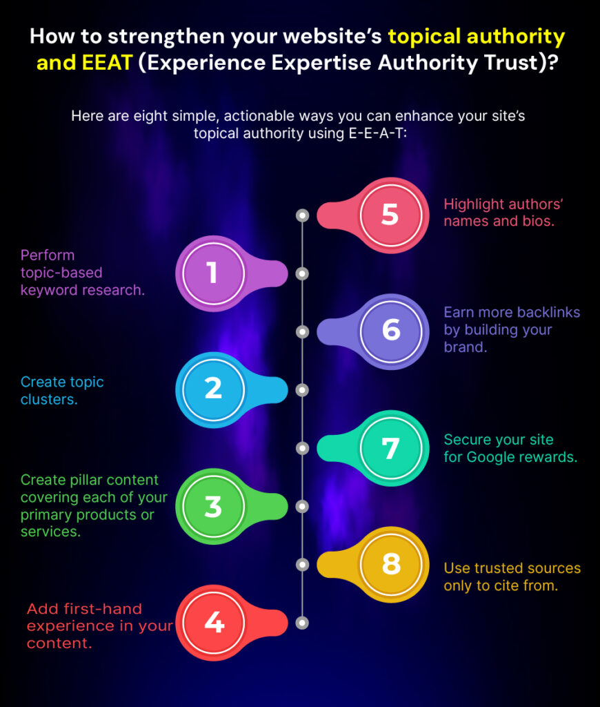Here are eight simple, actionable ways you can enhance your site’s topical authority using E-E-A-T: